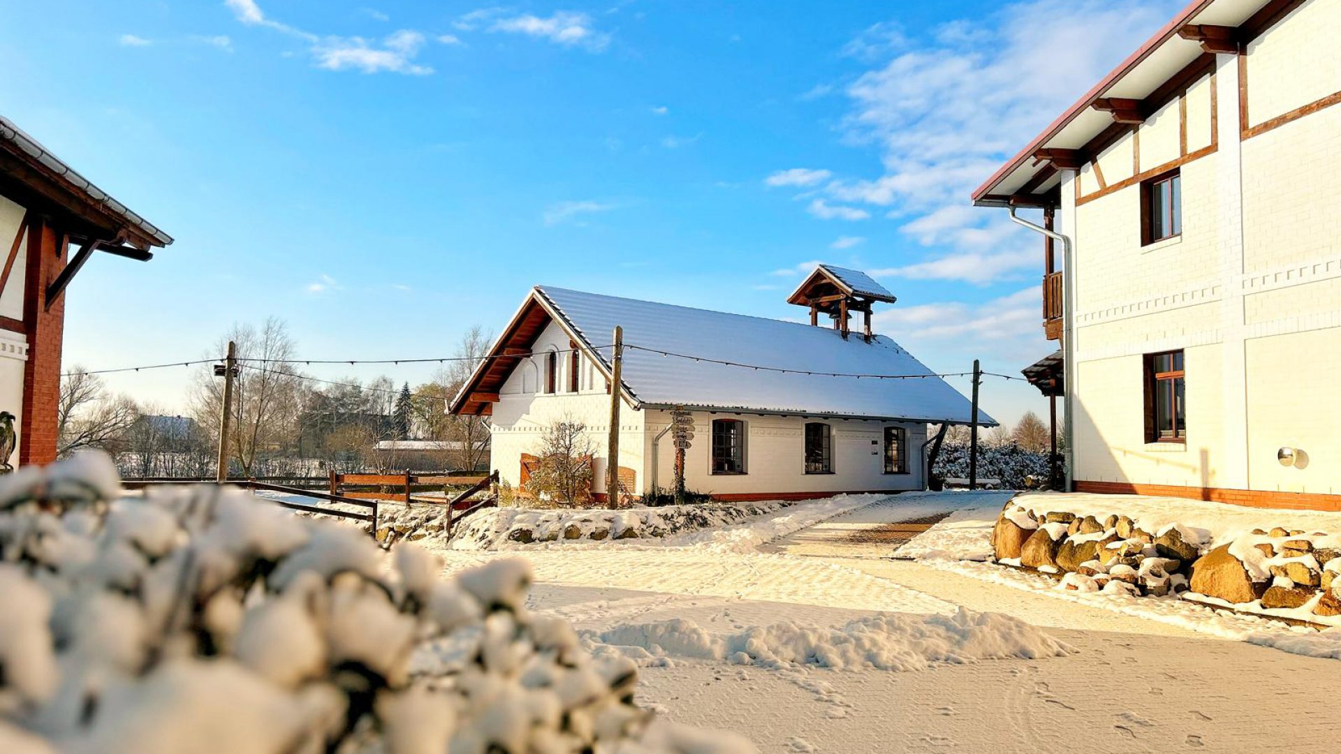 • Außensicht Eventscheune und Hofkirche im Winter auf dem Golchener Hof